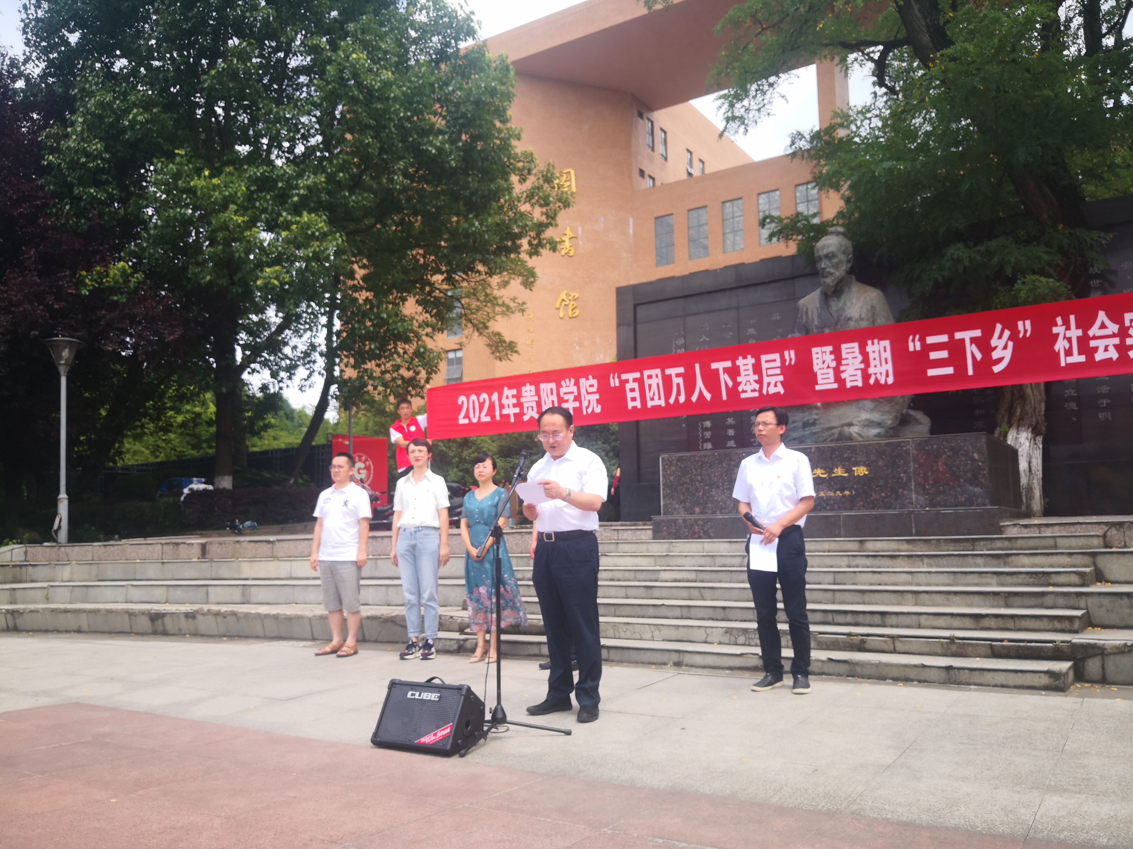 2021年7月16日上午,校团委于阳明广场举办2021年贵阳学院“百团万人下基层”暨暑期“三下乡”社会实践活动启动仪式,校党委书记吕保平、校党委副书记赵福菓亲临启动仪式。校党委办公室、校党委宣传部、校团委相关老师及120名志愿者出席启动仪式。仪式由校团委书记彭钟山主持。