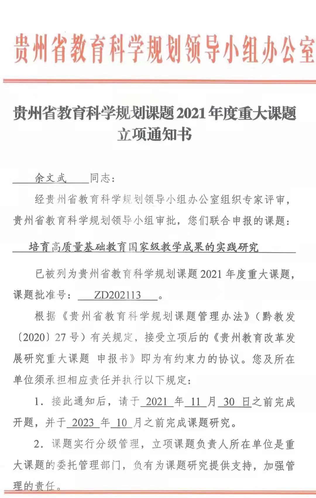 近日公布的贵州省教育科学规划课题2021年度重大课题立项名单,我校余文武教授主持的课题“培育高质量基础教育国家级教学成果的实践研究”获批立项。