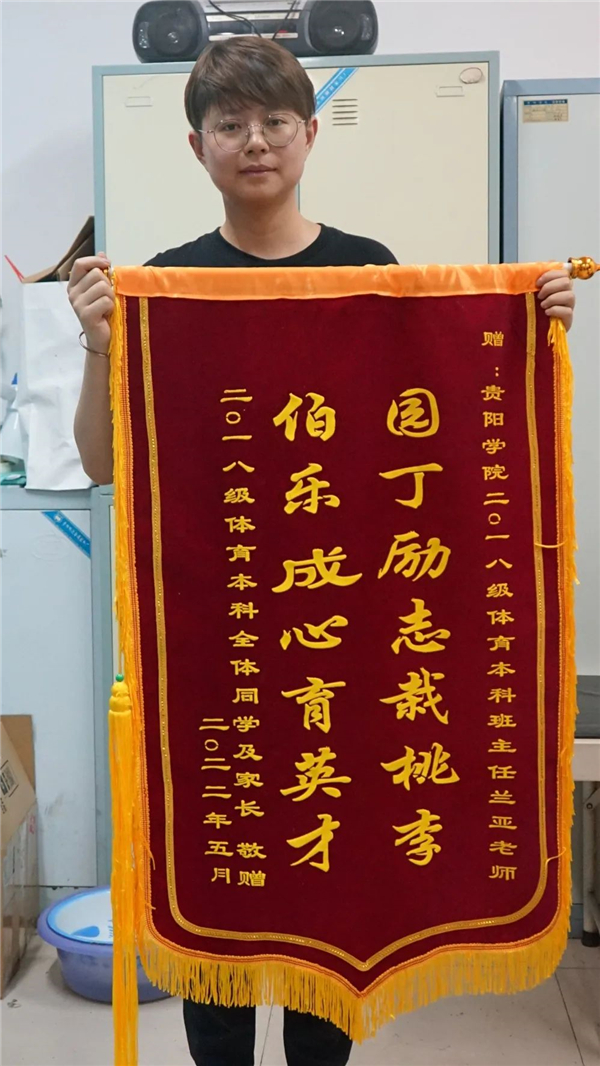 也正是因为如此,这份喜悦和感恩伴随着一面锦旗来到了贵阳学院党委书记吕保平的办公室,送锦旗者正是18级体教的同学和他们的家长,他们感恩学校提供的平台和资源。与此同时,同样一幅锦旗也被送到了兰亚老师的办公室,同学们感恩这位陪伴他们四年风雨,一直甘心付出的“老班”。