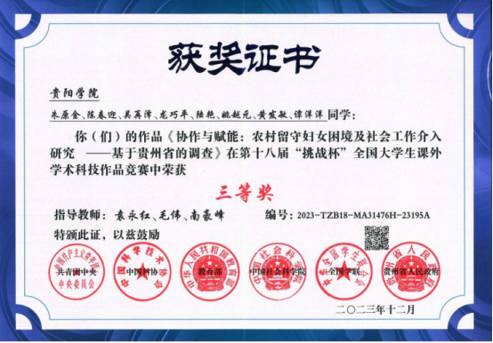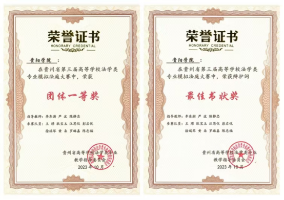 4.近三年在全国“挑战杯”比赛共获得9个奖项,其中在2023年第十八届“挑战杯”获得国赛三等奖一项,实现贵阳学院建校以来该赛事的国赛奖项的首次突破。荣获第三届贵州省高等学校法学类专业模拟法庭大赛团体一等奖、最佳书状奖(公诉意见书)和最佳书状奖(辩护词)。2021年,在教育部国家级实验教学示范中心法学组联席会主办的第八届全国大学生模拟法庭竞赛中,与来自中国政法大学、西南政法大学、华东政法大学、中南财经政法大学、西北政法大学、重庆大学、北京航空航天大学、中山大学等知名院校的23支代表队同台竞技,获得“最佳书状奖”和“团体优秀奖”。在“建行杯”第九届中国国际“互联网+”大学生创新创业大赛贵州省决赛“青年红色筑梦之旅”赛道中获银奖。