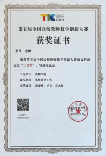 教师在全国高校教师教学创新大赛中获得三等奖1项,贵州省高校教师教学创新大赛中获得一等奖1项、二等奖4项。获批教育部供需对接就业育人项目1项,贵州省高等教育教学成果奖三等奖2项。