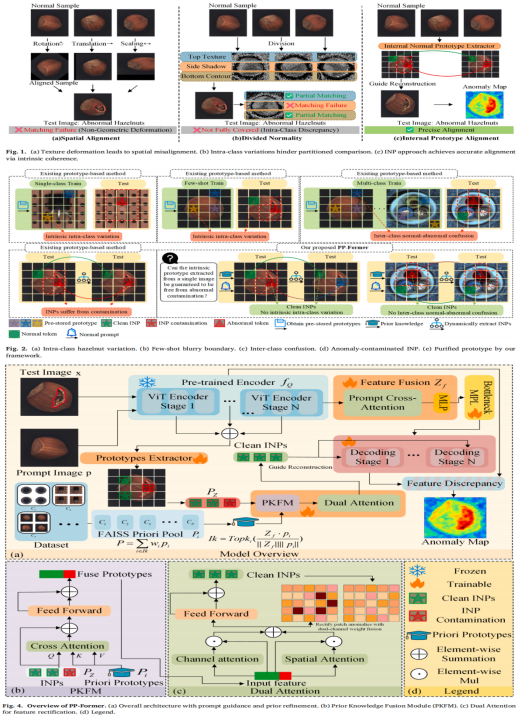 针对内在正常原型在工业异常检测中的污染难题,本研究提出PP-Former原型纯化框架。通过引入先验知识、提示引导与动态特征门控机制,实现了对原型的可靠净化。在六大工业数据集上验证了其显著优势,且轻量化设计确保了方案的高精度与高实用性。该研究成果有力推动了AI工业异常检测的落地应用。