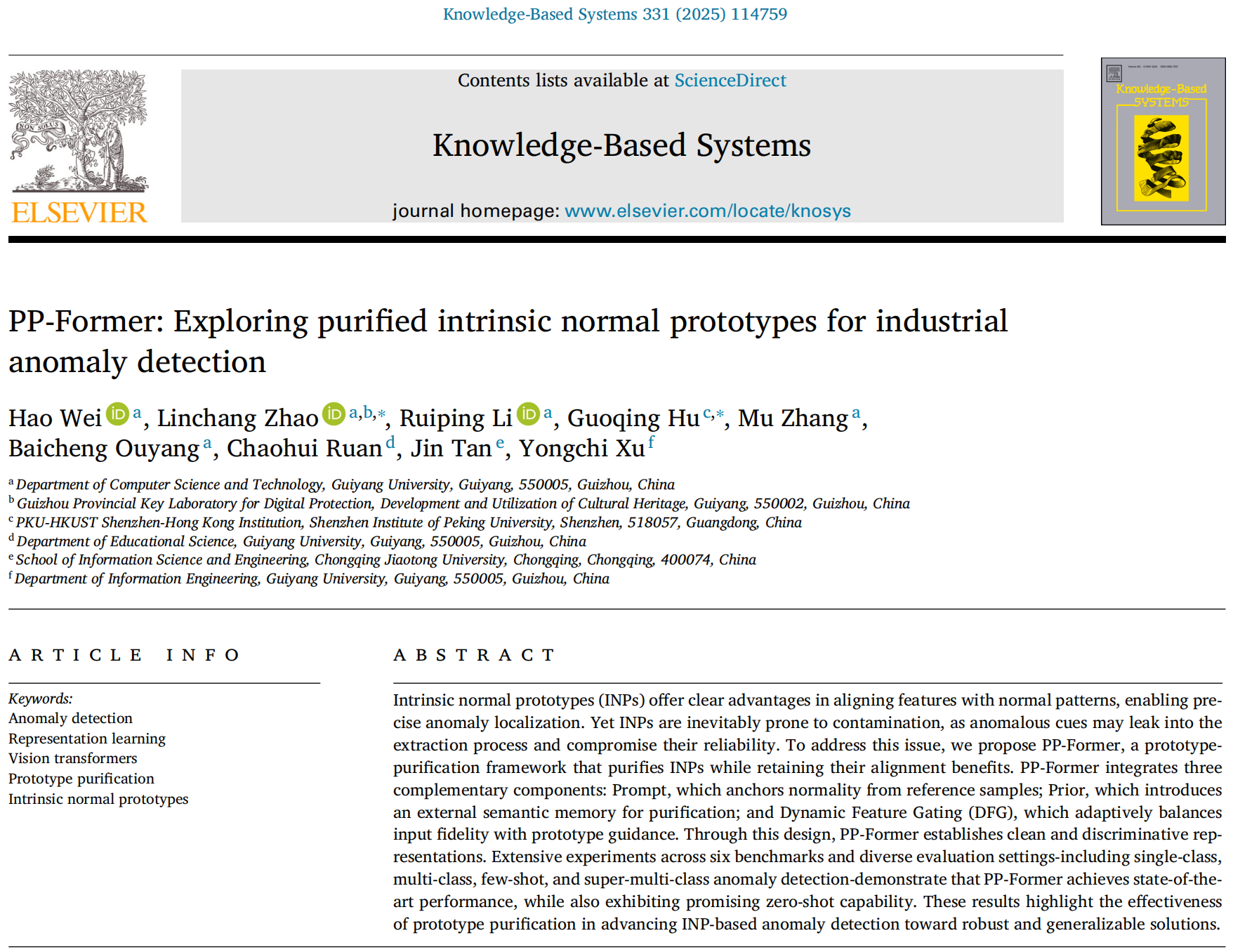 近日,学校计算机科学学院赵林畅团队研究生在国际知名期刊《Knowledge-Based Systems》(中科院1区top期刊,影响因子7.6)发表题为“PP-Former: Exploring purified intrinsic normal prototypes for industrial anomaly detection”的研究论文。团队成员2023级电子信息专业大数据方向硕士研究生魏灏为第一作者,赵林畅为通讯作者,贵阳学院为第一单位。