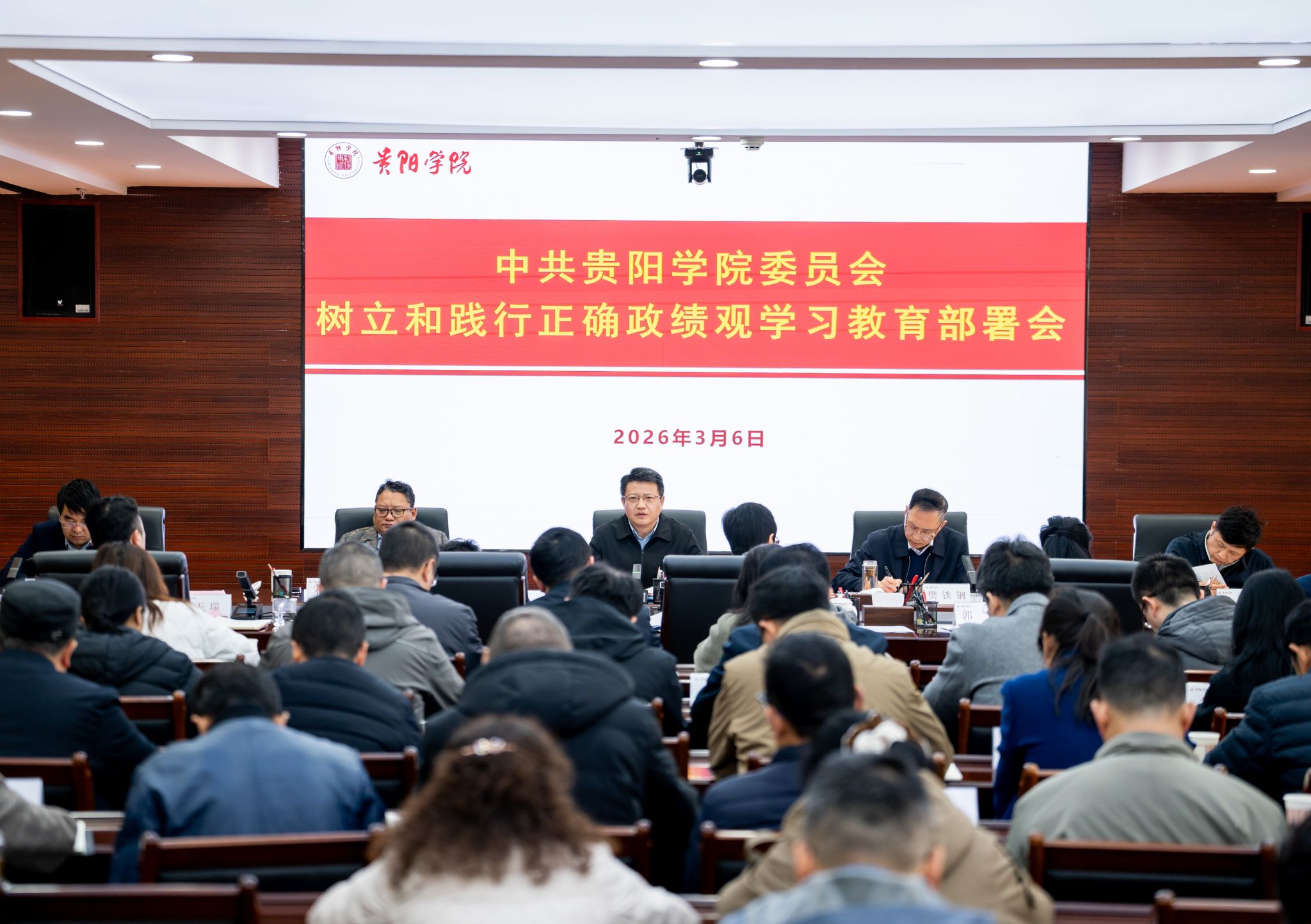 会议指出,政绩观是干部干事创业的总开关、指南针、试金石,关乎发展方向、关乎民心向背、关乎事业成败。开展树立和践行正确政绩观学习教育,是党中央着眼党和国家事业发展全局作出的重大部署。全校上下要切实提高政治站位,深刻领会开展学习教育的重大意义,切实把思想和行动统一到党中央和省委的部署要求上来。要通过学习教育引导全校党员干部和教职工树立正确的发展观和业绩观,努力创造经得起实践、人民和历史检验的实绩。