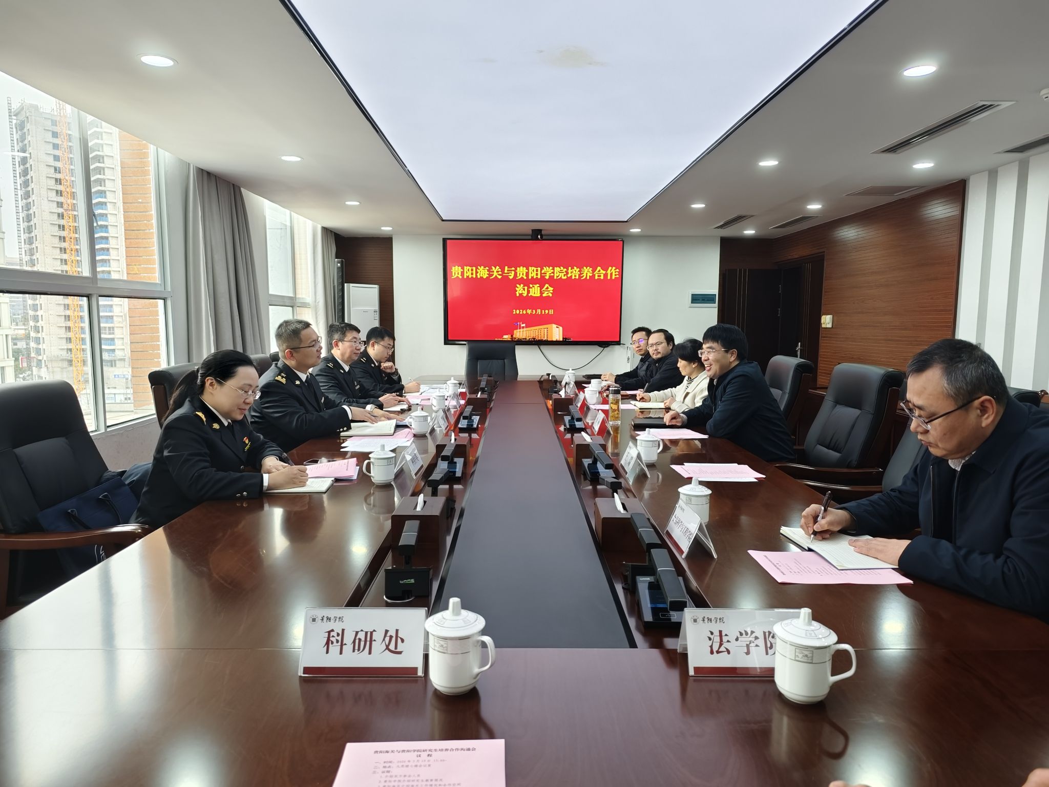 曹旭、罗吉分别介绍了贵阳海关在动植物检疫、进出口食品监管、口岸风险防控等方面的工作情况。双方围绕生物安全、进出口食品安全、国际商务贸易、知识产权保护等领域,就学科建设、研究生培养、校外实践教学基地建设、科研联合攻关、成果转化等深入交流。