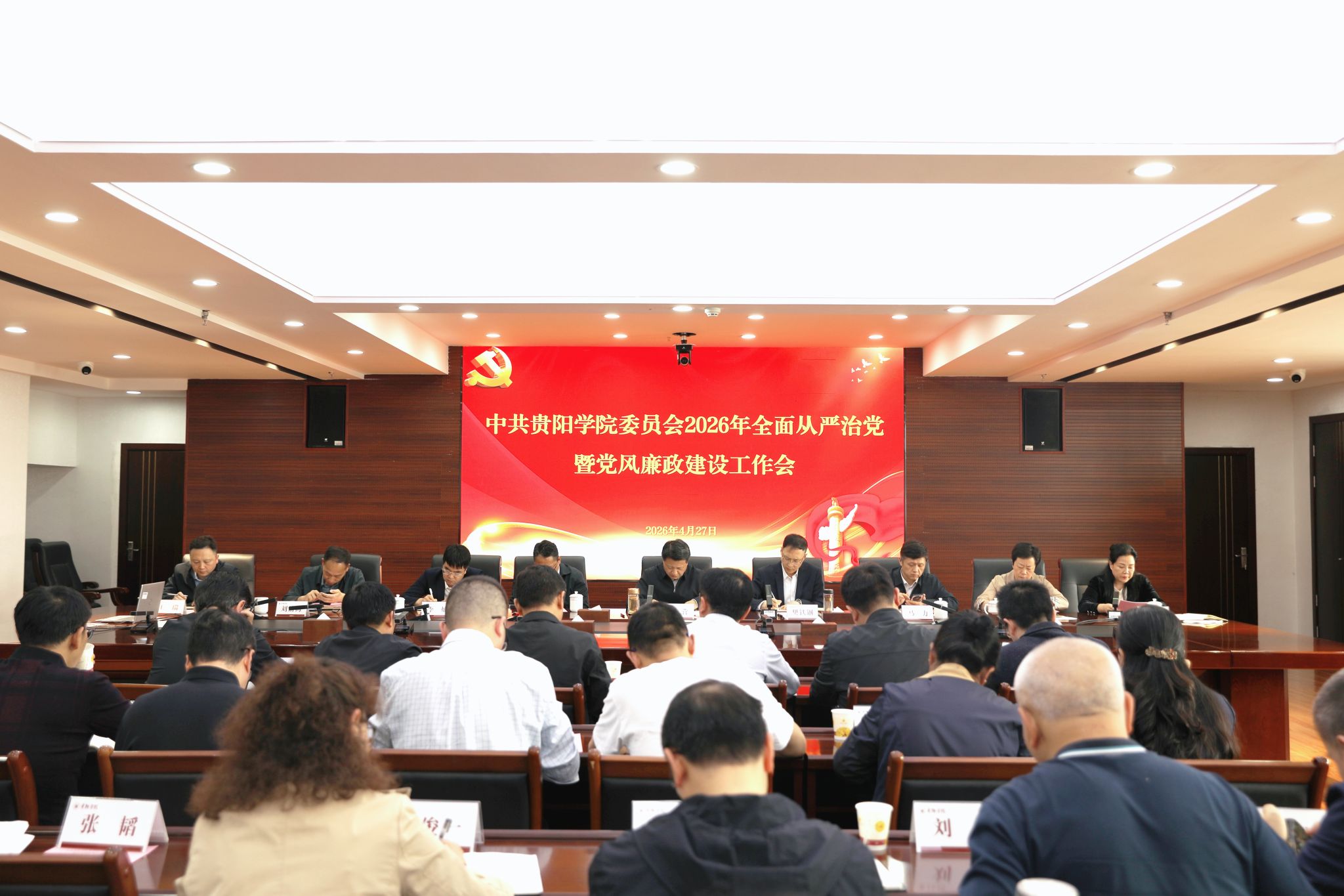 4月27日,贵阳学院在九思楼八楼会议室召开2026年党建工作暨全面从严治党、党风廉政建设工作会议。校党委书记黄营出席会议并讲话,校党委副书记、校长樊铁钢主持会议。全体校领导、专业学院党政主要负责人和校直部门负责人参加会议。
