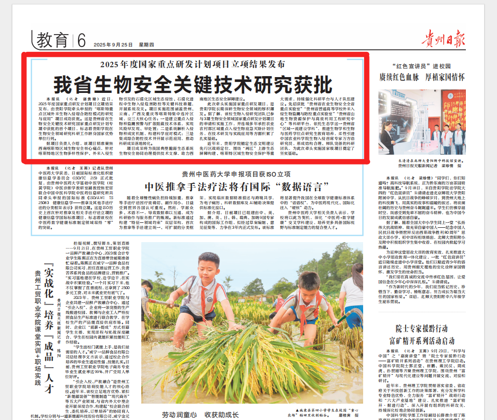 本报讯(记者 谌贵璇)近日,2025年度国家重点研发计划项目立项结果发布,由贵阳学院牵头申报的“喀斯特重点区域外来生物入侵综合防控模式的研究与应用”项目成功获批。这是贵州省在生物安全关键技术研究国家重点研发计划专项中获批的首个项目,标志着贵阳学院在生物安全领域研究科研工作跻身国家优势单位行列。
