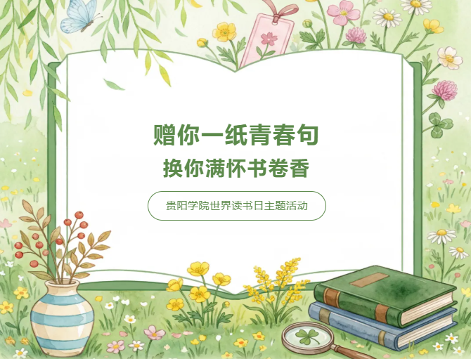 为迎接第31个“4·23”世界读书日,营造浓厚书香校园氛围,丰富校园文化生活,贵阳学院于近日举办“赠你一纸青春句,换你满怀书卷香”主题系列活动。活动分为线上征集与线下互动两大板块。线上“光影心语”板块面向全校征集校园美照与励志语录,优秀作品将进行线上展示及投票评选,获奖者可获得校级文创礼品。线下活动将于4月23日12:00至20:00在阳明广场举行。本次活动面向全体在校学生,届时将开展打卡定格拍照、抖音互动留言、线上获奖文创礼品领取等丰富环节,其中“文脉快答”专场将于当日18:00正式开启,围绕诗词名句、经典名言及阳明文化语录进行现场抢答,参与者可赢取定制校园明信片等纪念品。