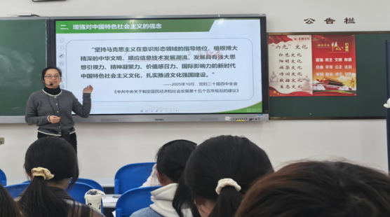 学校充分发挥思政课教师“主心骨”、专业课教师“排头兵”作用,让课堂成为传播党的创新理论、培育时代新人的核心教育教学阵地。马克思主义学院精心组织思政课教师通过学习研讨、集体备课、公开课展示等途径将党的二十届四中全会精神和省委十三届八次全会精神与课程内容深度融合,实现理论教学与时代精神同频共振。例如,在“中国式现代化”教学章节,补充全会关于“十五五”时期是基本实现社会主义现代化夯实基础关键时期的论述;在“高质量发展”相关内容中,融入全会提出的“推动科技创新和产业创新深度融合”“发展新质生产力”等重要部署;在“民生建设”模块,结合全会对共同富裕的部署,新增普惠性民生建设、收入分配制度完善等教学案例;在国家安全上的新论述等。