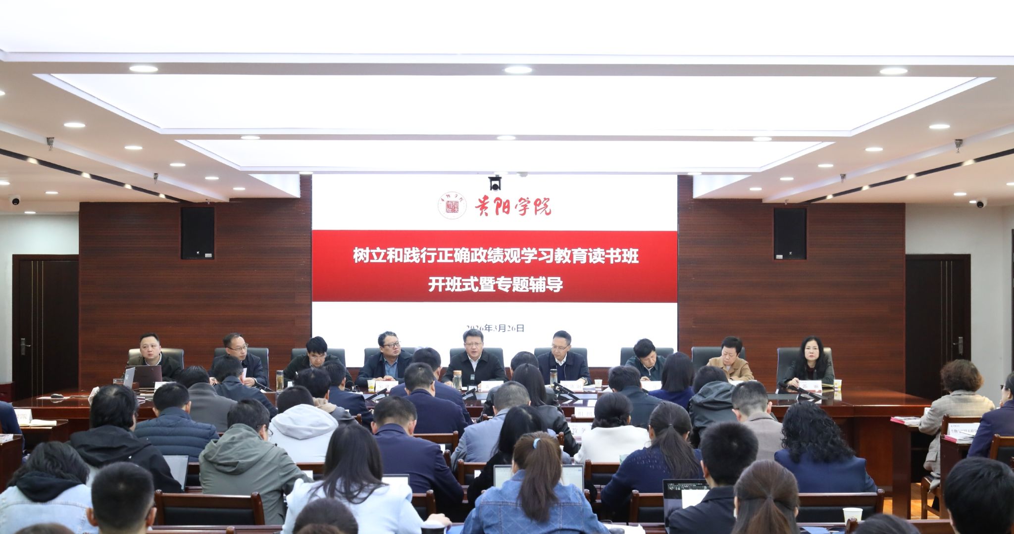3月26日,贵阳学院举办树立和践行正确政绩观学习教育读书班开班式暨专题辅导。校党委书记黄营主持开班式并作动员讲话,校领导班子成员、全校副处级以上领导干部及学习教育专班全体人员参加。