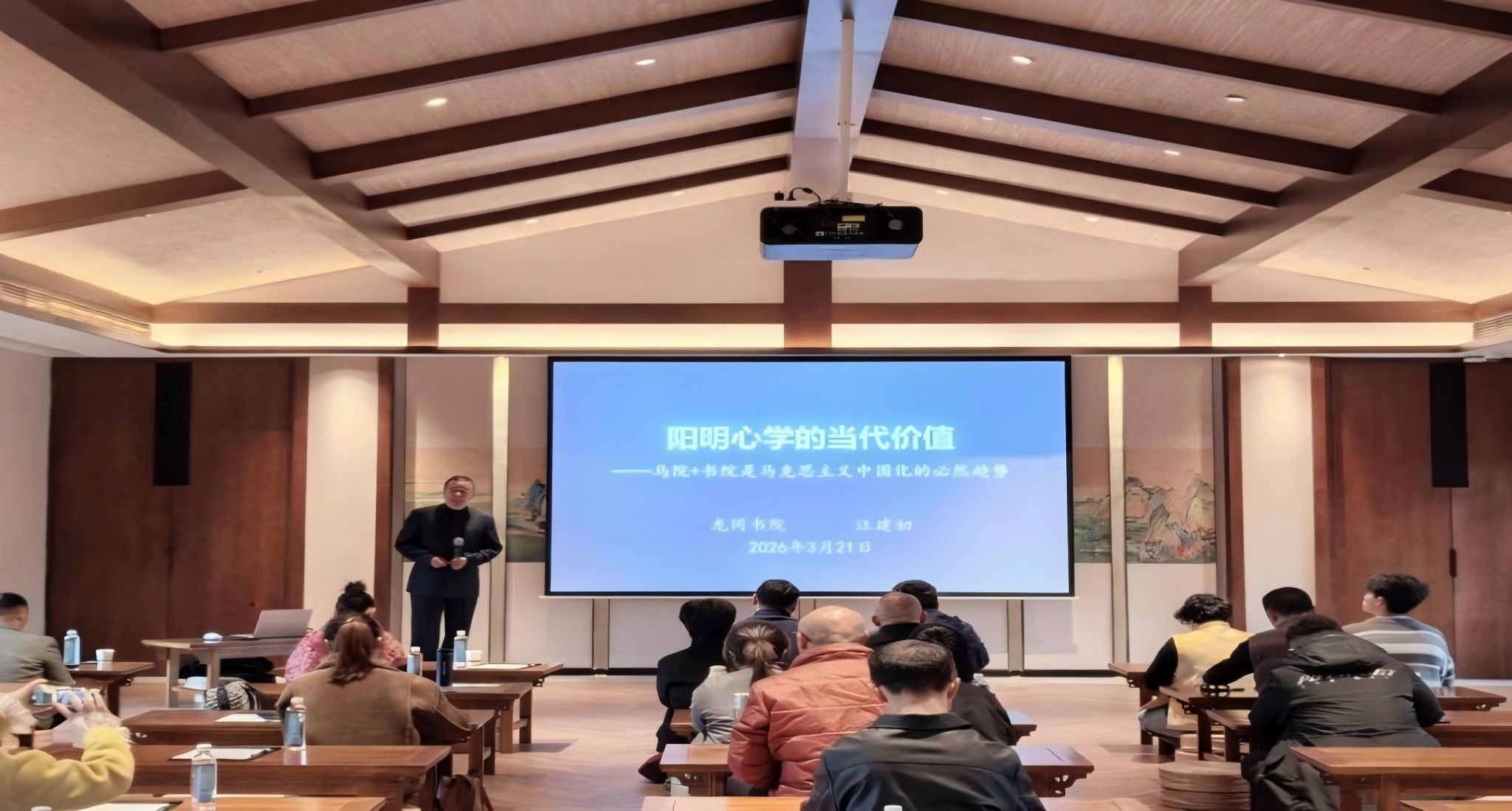 近日,2026年龙冈书院周末研习社首场公益课堂在修文龙冈书院开讲。本次讲座由贵阳学院教授、硕士生导师,龙冈书院名誉院长、香港阳明学堂顾问、国际儒学联合会理事汪建初教授担任主讲,他以“阳明心学的当代价值——‘马院+书院’是马克思主义中国化的必然趋势”为题,为阳明文化爱好者、高校师生代表带来了一场思想深邃、内容丰富的精神盛宴。贵阳学院阳明学与黔学研究院副院长任健教授和贵阳学院马克思主义学院、音乐学院师生参加了此次活动。